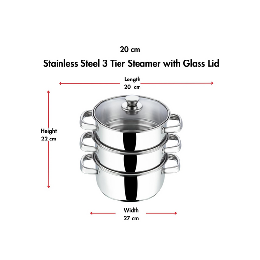 Vinod Stainless Steel 3 Tier Steamer/Momo/Modak Maker with Glass Lid & Riveted Handles- 7.8 inches (Induction and Gas Stove Friendly), 2 Year Warranty, Silver