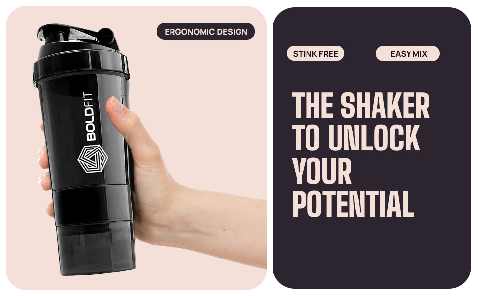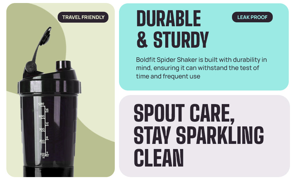- Boldfit Spider Gym Shaker Bottle, Shakers for Protein Shake with 2 Storage Compartment Gym protein shaker for workout (High Density Polyethylene, Pack of 1, Black),500 ml