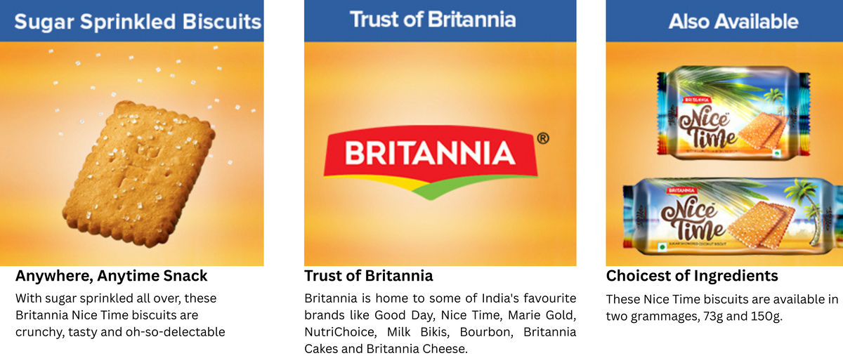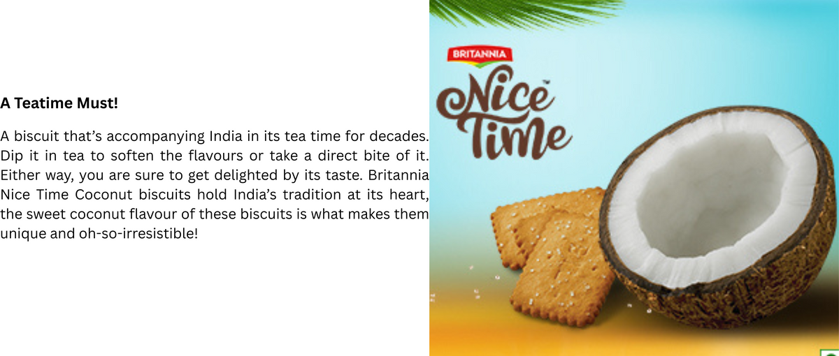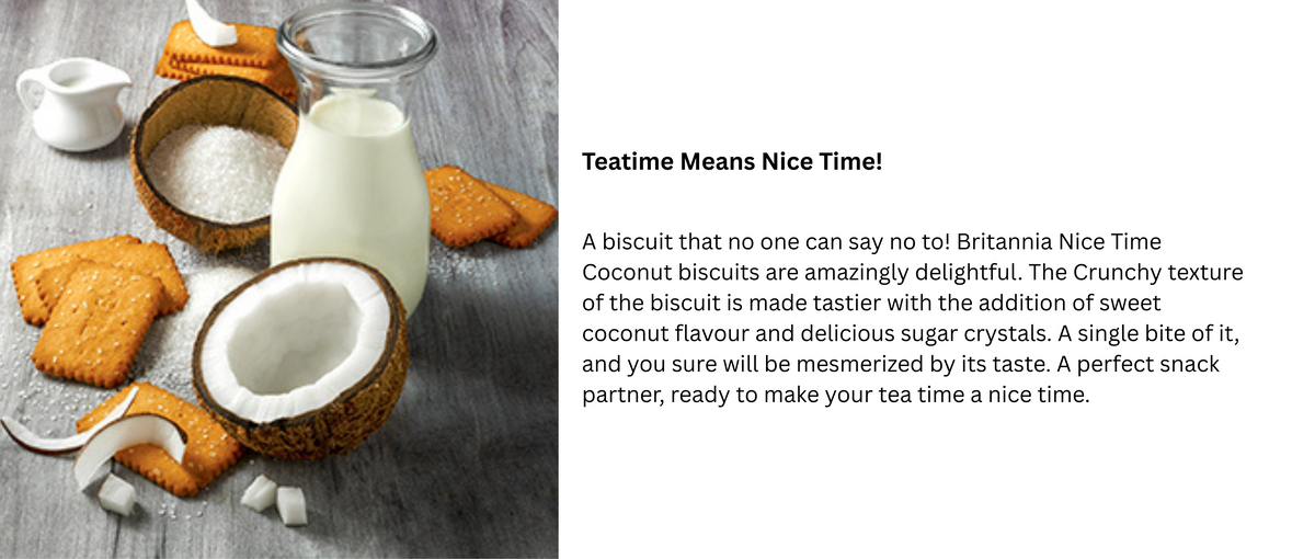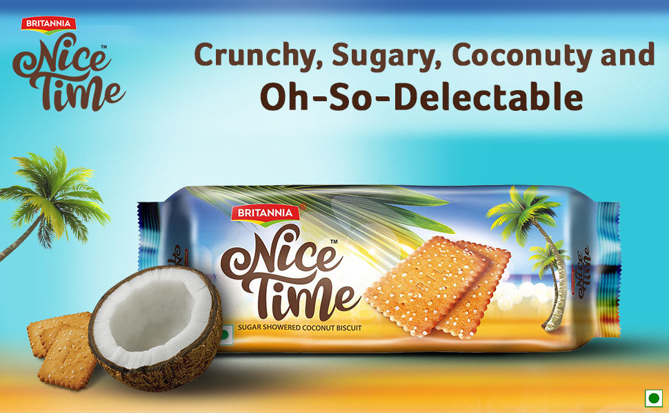 - Britannia Nice Time Coconut biscuits instantly offer you the feel of your favorite tropical destination. Nothing else in the world quite matches up to the unique, creamy taste; they continue to be a favorite snack today. Britannia Nice Time Coconut snacks contain real bits of coconut.