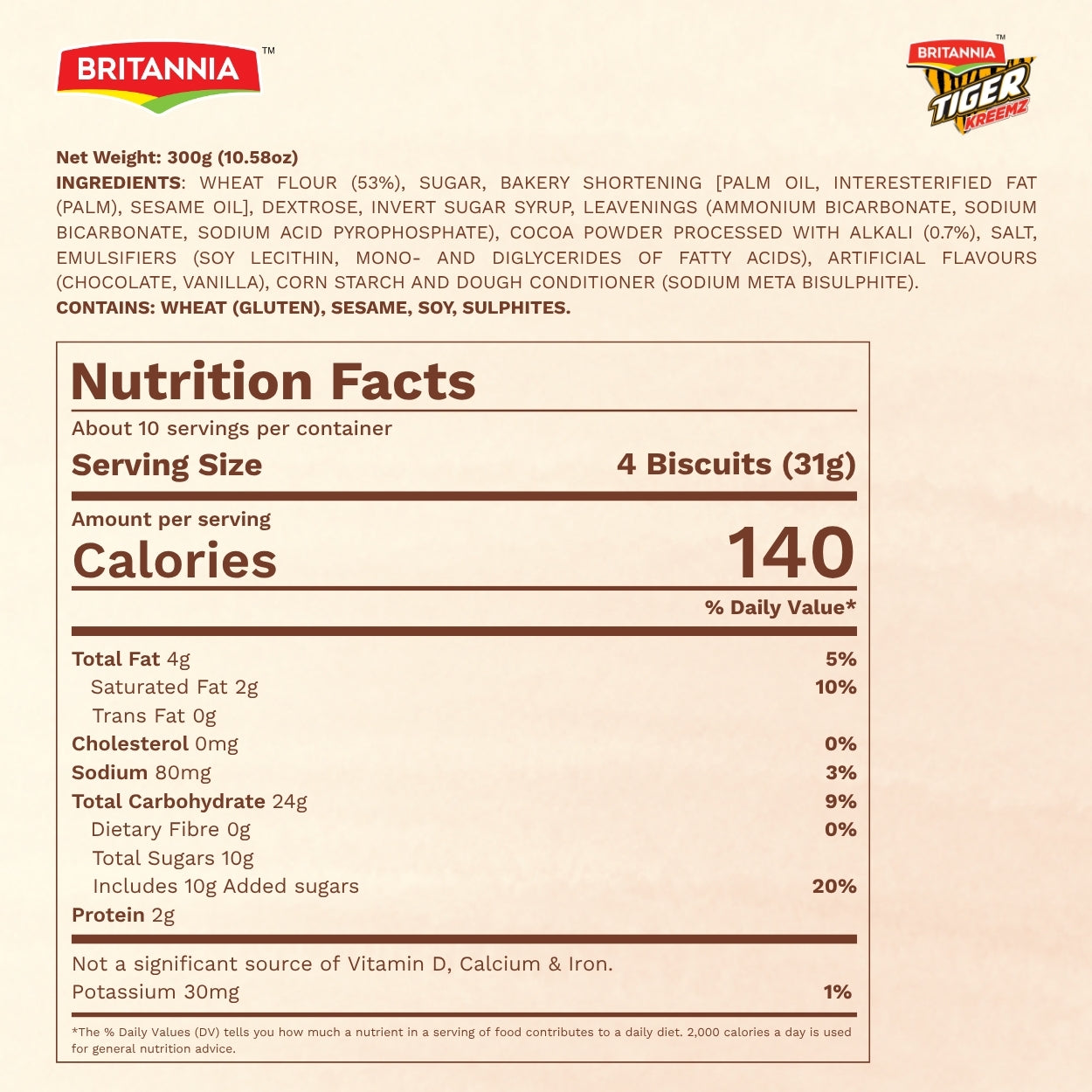 Britannia Tiger Kreemz Choco Cream Biscuits Family Pack 300 Gm| Rich Chocolate Cream-Filled Cookies Perfect For Snack time