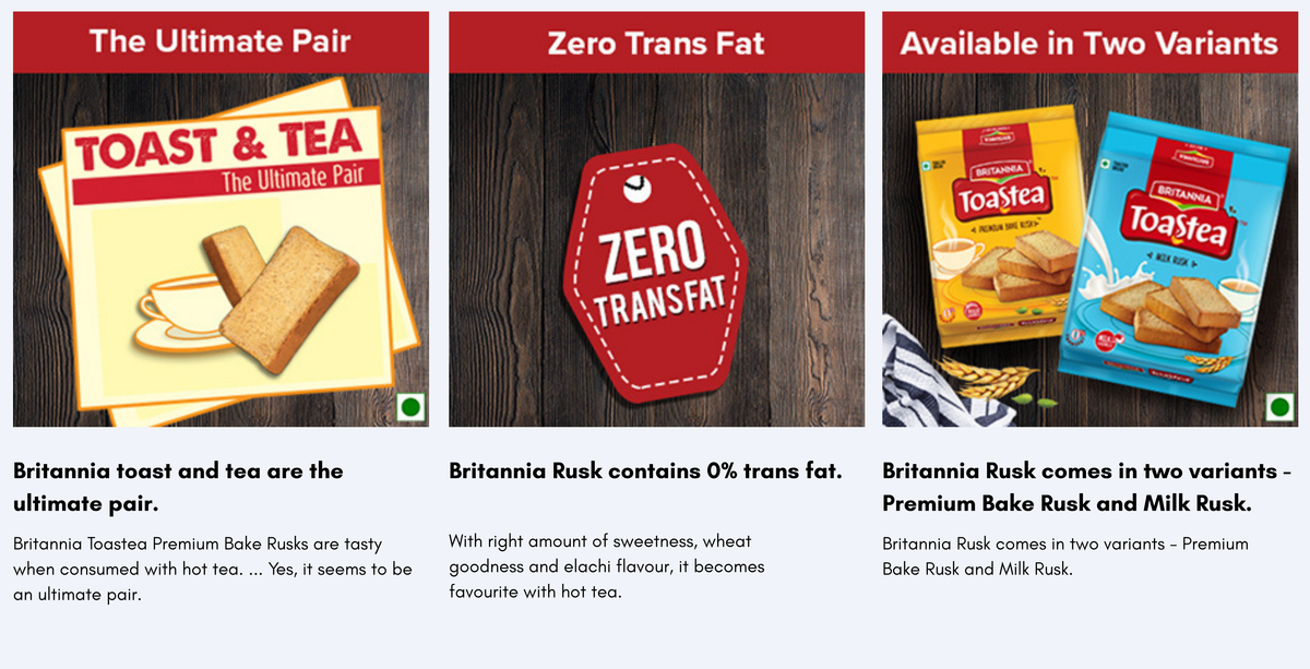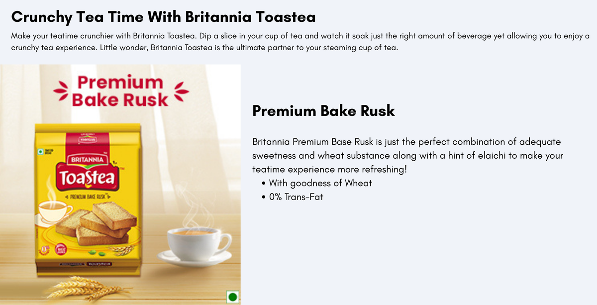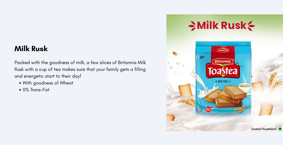 - It is a great option for snacking or to satisfy your hunger anytime. Made from premium ingredients, Britannia Rusk is crispy and delicious - once you try it, your tea time will be incomplete without it.