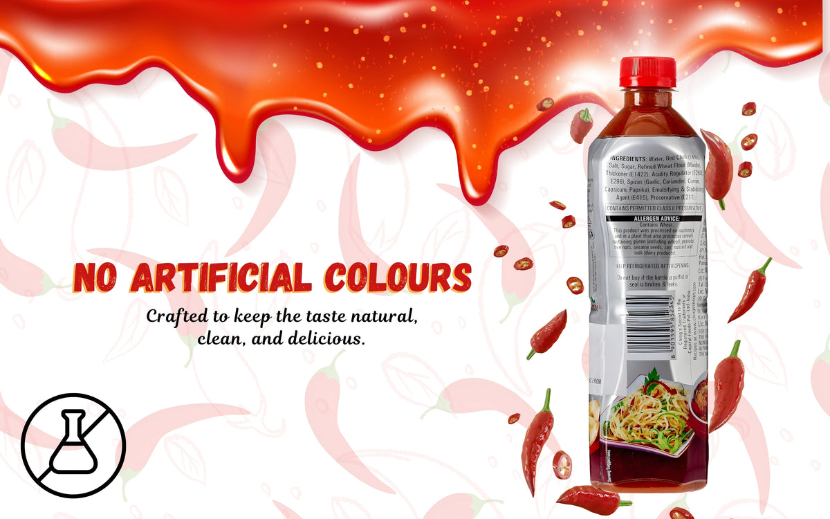 - Hot and tangy red chilli sauce made from quality red chilies and spices