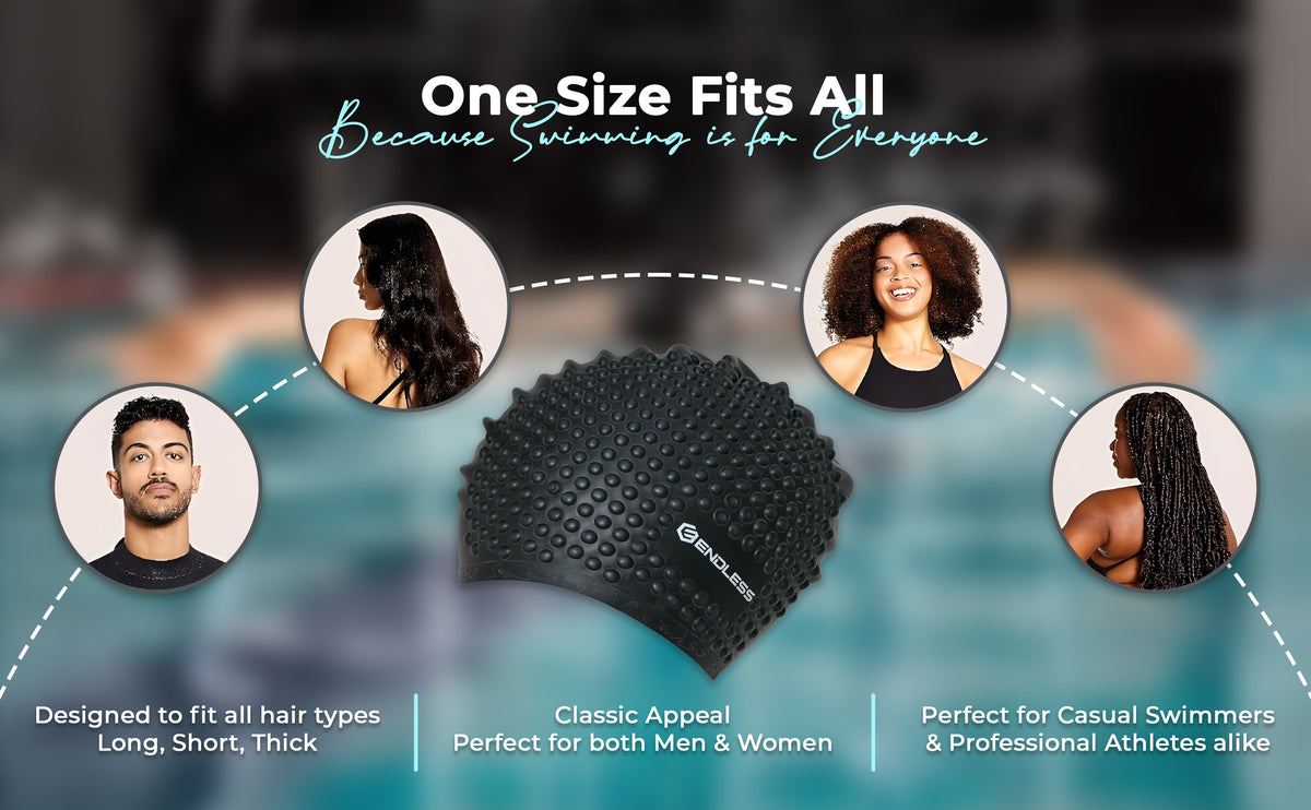 - EFFORTLESS FIT: Designed for hassle-free use, this swim cap effortlessly stretches to accommodate various hair lengths, including long, short, and thick hair. Its universal sizing ensures a comfortable fit for men, women, and children