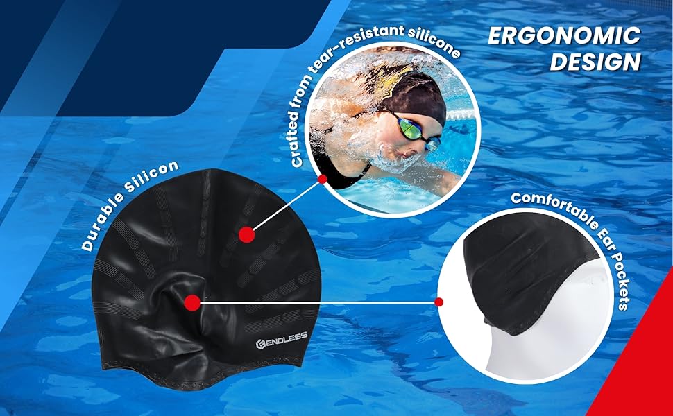 Endless EL1023 Comfortable Silicon Swimming Cap with Ergonomic Ear Pockets | Material : Silicon | Fully Elastic Waterproof Cap for Long and Short Hair with Thicker Edge | For Women and Men