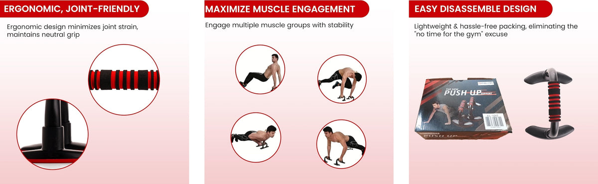 - FLEXIBLE WORKOUT ROUTINE: With these portable push-up bars, exercising becomes convenient at home, in the office, or during travel. Their lightweight and easily disassembled design allow for hassle-free packing into any suitcase or backpack, eliminating the "no time for the gym" excuse from your daily schedule.