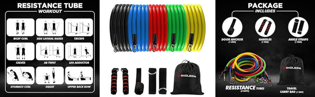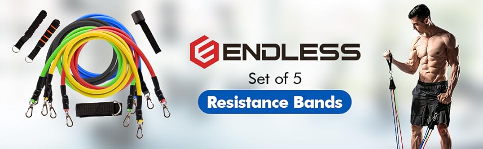 ENDLESS EL1043 Toning Tubes Set of 5 with Different Resistance Levels | Multi Color | Material: Natural Latex | with Door Anchor, Handles, Waterproof Carry Bag, Leg Ankle Straps for Men and Women