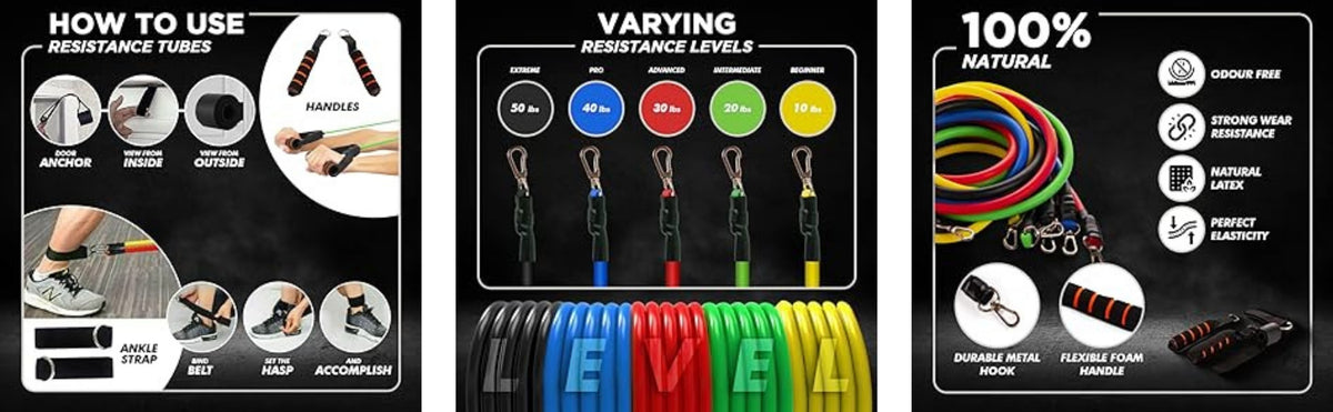 - HIGH-QUALITY NATURAL LATEX RUBBER CONSTRUCTION: The Resistance tubes boast a sturdy and flexible design, crafted from top-notch 100% natural latex rubber. This composition ensures exceptional durability and elasticity, allowing for high-intensity workouts and the ability to push your limits confidently.