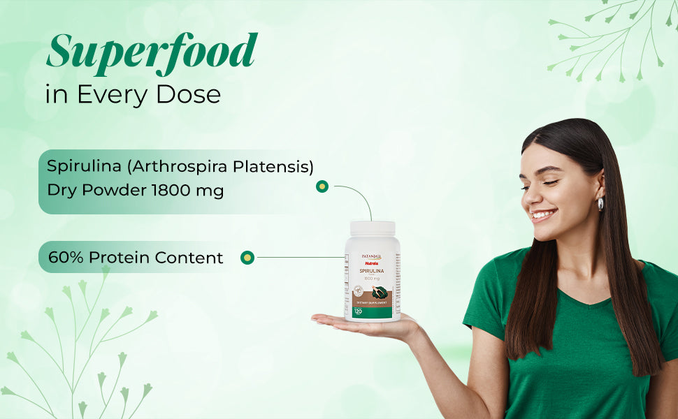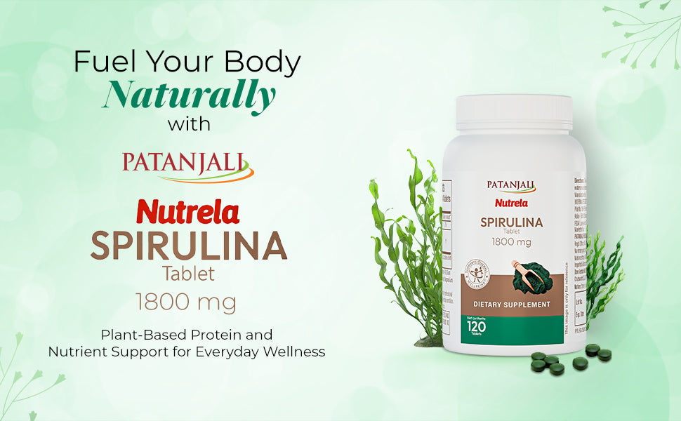 Patanjali Nutrela Spirulina 1800 mg | Natural Superfood Supplement for Energy, Immunity & Overall Wellbeing | 120 Tablets | Vegetarian | Unflavoured | For Adults