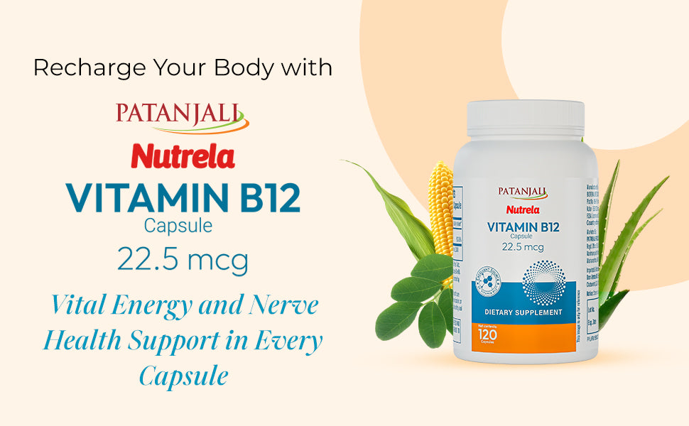Patanjali Nutrela Vitamin B12 Supplement | 22.5 mcg Capsules for Energy, Focus & Nerve Support | Vegetarian | 120 Capsules