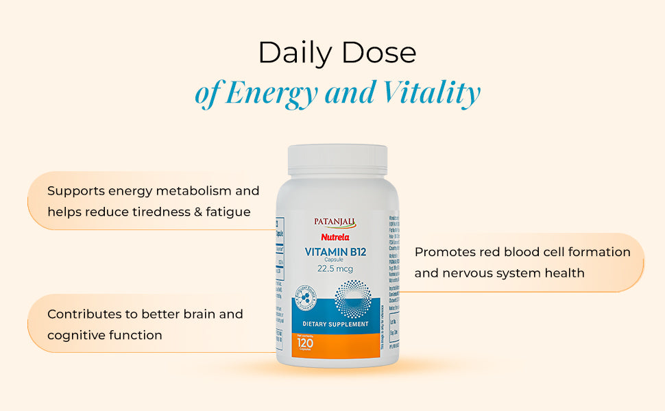 - PROVIDES Daily Nourishment: Patanjali Nutrela Vitamin B12 is a scientifically formulated dietary supplement to fulfill the daily requirement of vitamin B12.