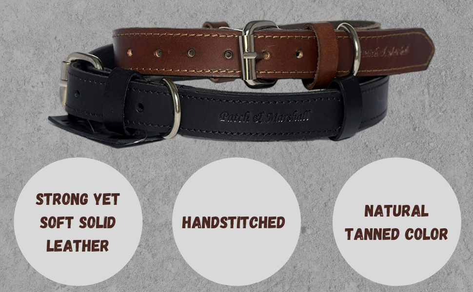 Patch & Marshall Pet Collar Genuine leather with soft-touch finish and reinforced stitching makes this collar ideal for puppies and small dogs. Adjustable to fit necks 12–16 inches, with a slim 3/4 in width. Packaged in a gift-ready box for convenience.