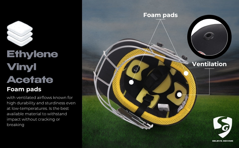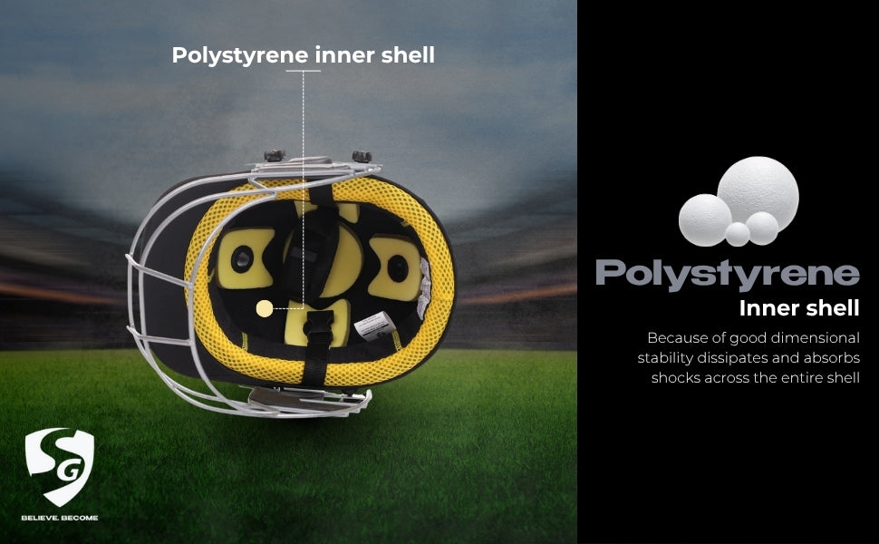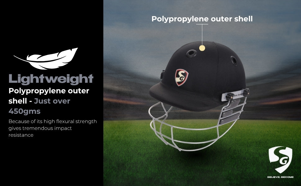 - Product Box Contents: 1 SG Cricket Helmet, Polypropylene outer shell, Polystyrene inner shell, EVA foam pads, Adjustable steel visor.